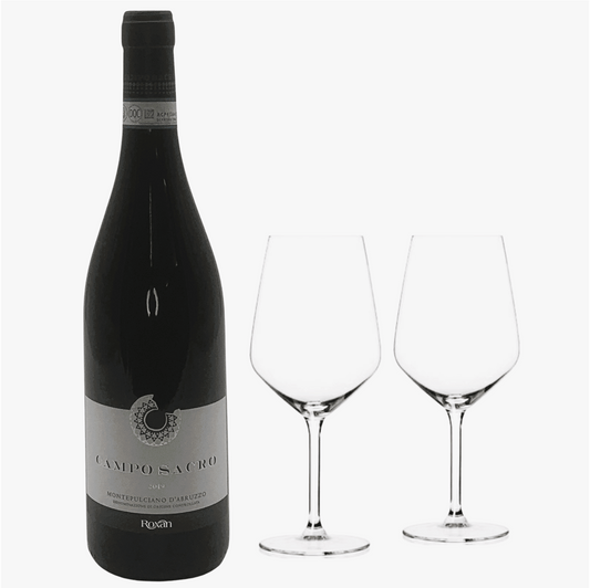 Montepulciano d'Abruzzo Campo Sacro 14%vol Casa Vinicola Roxan 2019 in scatola con calici in vetro