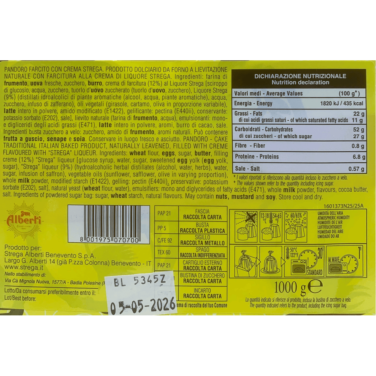 Pandoro alla crema di liquore Strega Alberti 1KG Lievitazione naturale (in busta regalo Strega collezionabile)